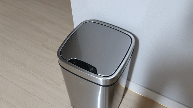 건전지 4개를 다 넣고 스위치를 ON으로 눌러놓으면 저렇게 센서가 작동하면서 휴지통 뚜껑이 열리고, 그때 쓰레기를 버리면 된다. 그리고 5초가 지나면 저절로 닫히는데 램프에 불이 5개에서 1개씩 점차 줄어드는 걸 알 수 있다. 램프가 다 꺼질 때 뚜껑이 닫힌다. 그리고 열린 채로 고정하고 싶다면 열림 버튼인 램프 왼쪽 그림을 눌러주면 고정이 되니 참고하시길 바란다.