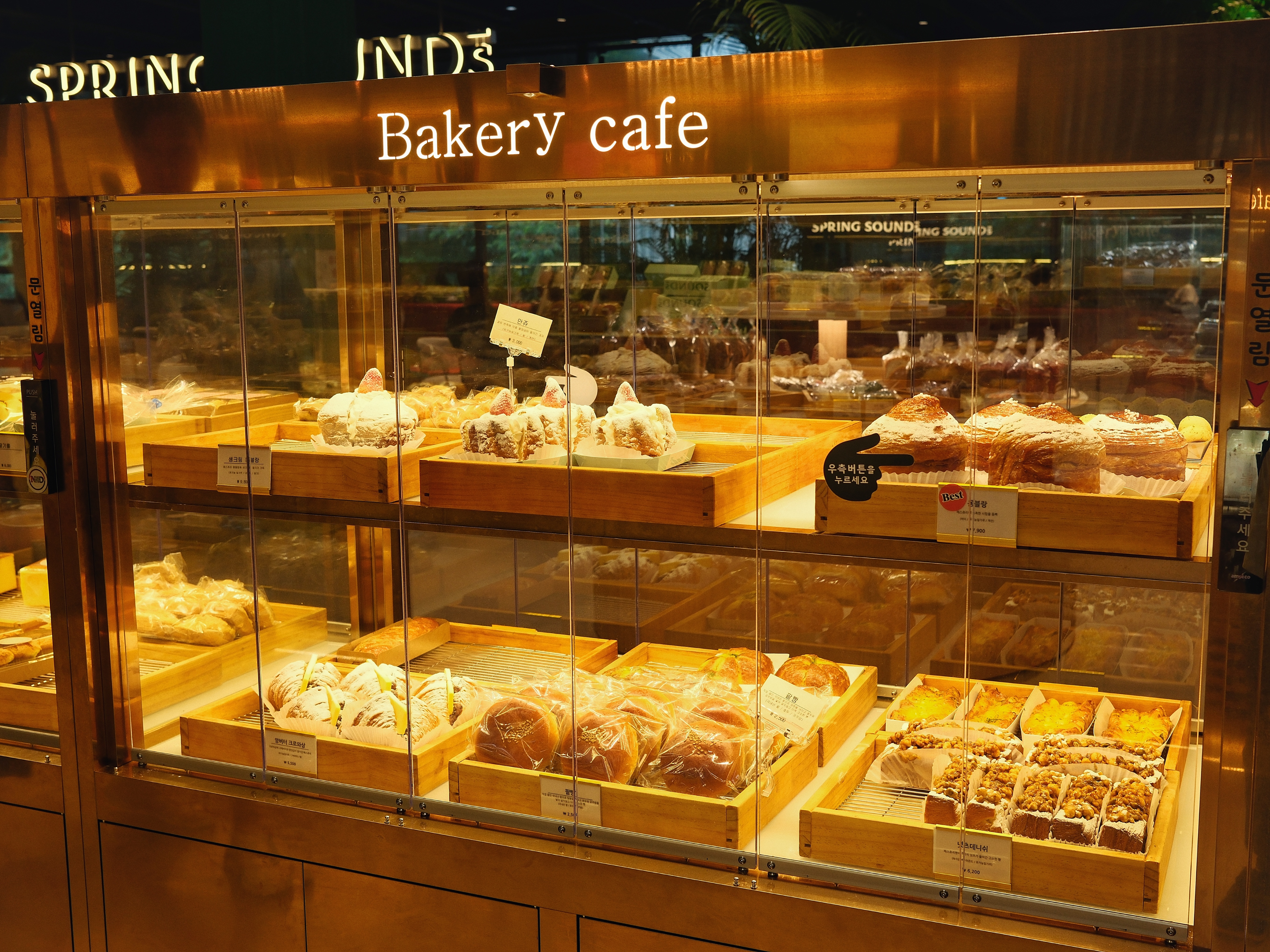 여러가지로 편했다고 표현한 건 일단 여기는 걸어올 곳은 아니다. 그래서 차 타고 와야 하는데, 주차하기 편하다는 점. 그리고 자리 걱정할 필요 없을 정도로 공간이 넓직하고 테이블이 많다는 점(1층 전체가 스프링 사운즈) 빵 종류가 다양해서 선택권이 많다는 점. 필요한 것들, 가령 포크, 컵, 티슈 등은 셀프바에 준비가 되어 있다는 점. 이런 점들 때문에 부담 없이 올 수 있겠단 생각이 들었다. 그리고 야외 테라스도 있어 바로 앞에 흐르는 손곡천과 광교산을 볼 수 있어 자연 속에 있는 기분을 느낄 수도 있을 것 같다.